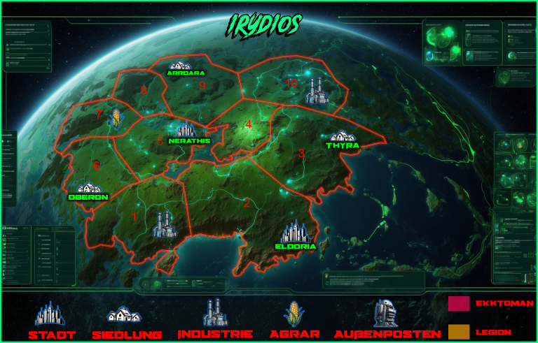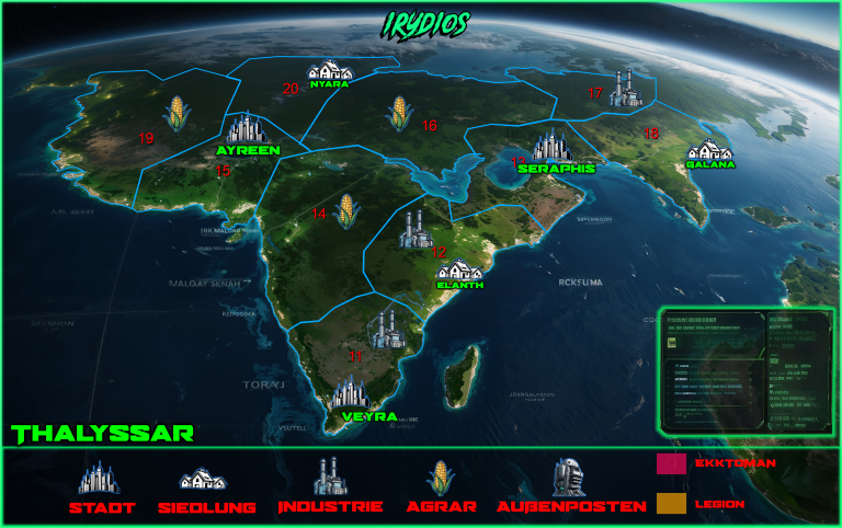 Im Süden des majestätischen Planeten Irydios erstreckt sich die Region Thalyssar, ein Land von vielfältigen Landschaften und großer strategischer Bedeutung. Diese Region ist nicht nur für ihre beeindruckenden Städte bekannt, sondern auch für ihre weitläufigen Agrarflächen, die eine zentrale Rolle in der Versorgung des gesamten Planeten spielen. Die Verdans, tief mit ihrer Umwelt verbunden, pflegen hier ein harmonisches Gleichgewicht zwischen Tradition und Fortschritt.